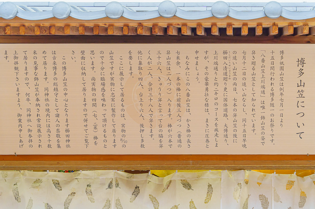 가게의 한가운데에는 "하카타 기온 야마카사 축제"의 "야마카사"가 놓여 있습니다.