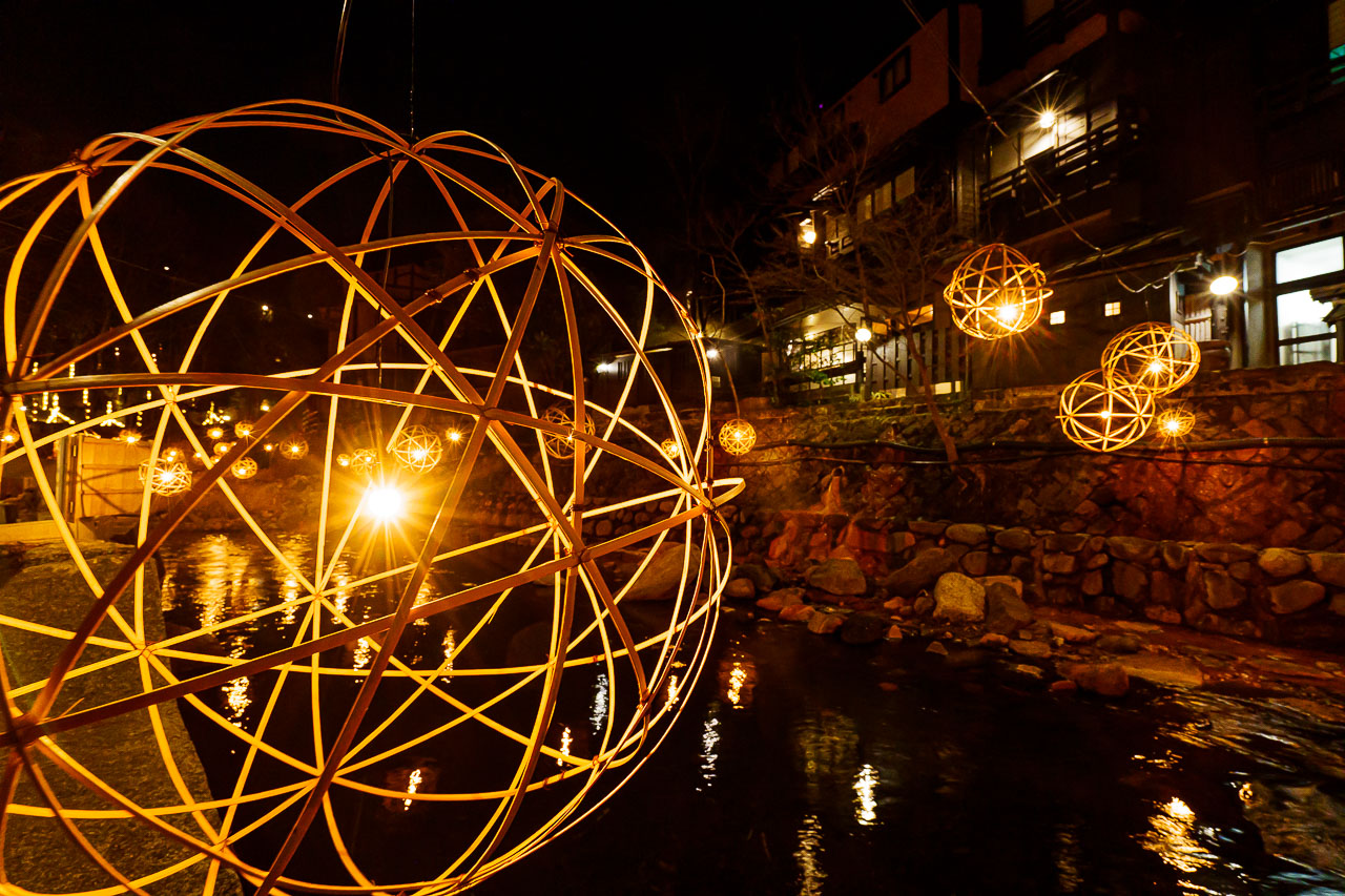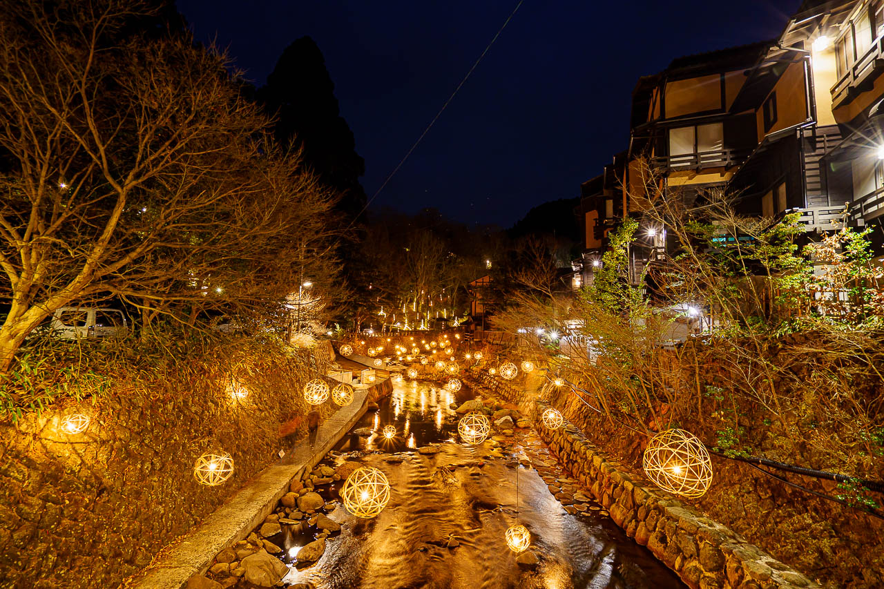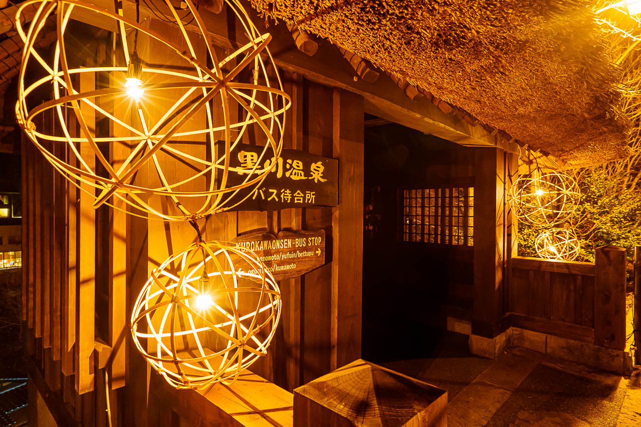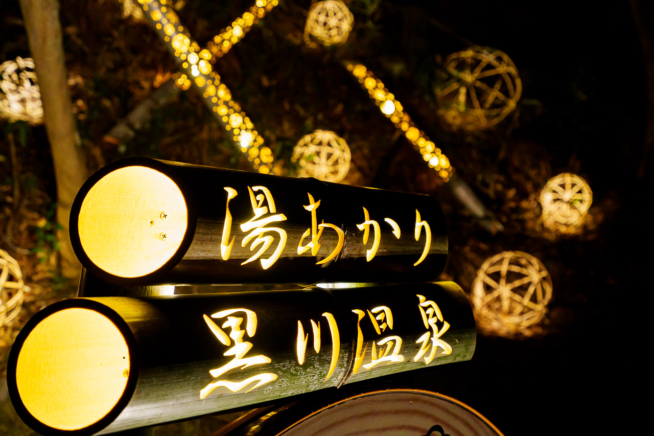 아름다운 대나무 등롱은 온천가의 가와바타 거리를 흐르는 '타노하라가와' 등 쿠로가와 온천 곳곳에 설치되어 있습니다.