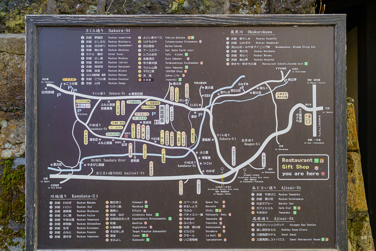 구로카와 온천은 규슈의 유후인, 벳푸 등 다른 유명 온천마을과 비교하면 더 깊은 구마모토의 아소산 자락 북부에 있으며 대규모의 현대적 시설이 없이 전통적 온천 료칸으로 가득한 작은 마을입니다.