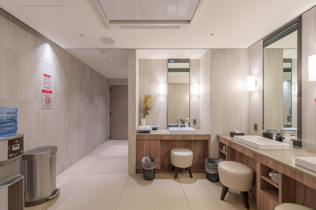파우더 룸의 바닥은 "류큐 다다미"를 사용하여 부드럽고 향긋하며, 정수기가 마련되어 있어 목욕 후 수분 보충도 할 수 있습니다.