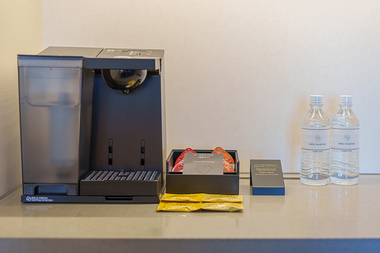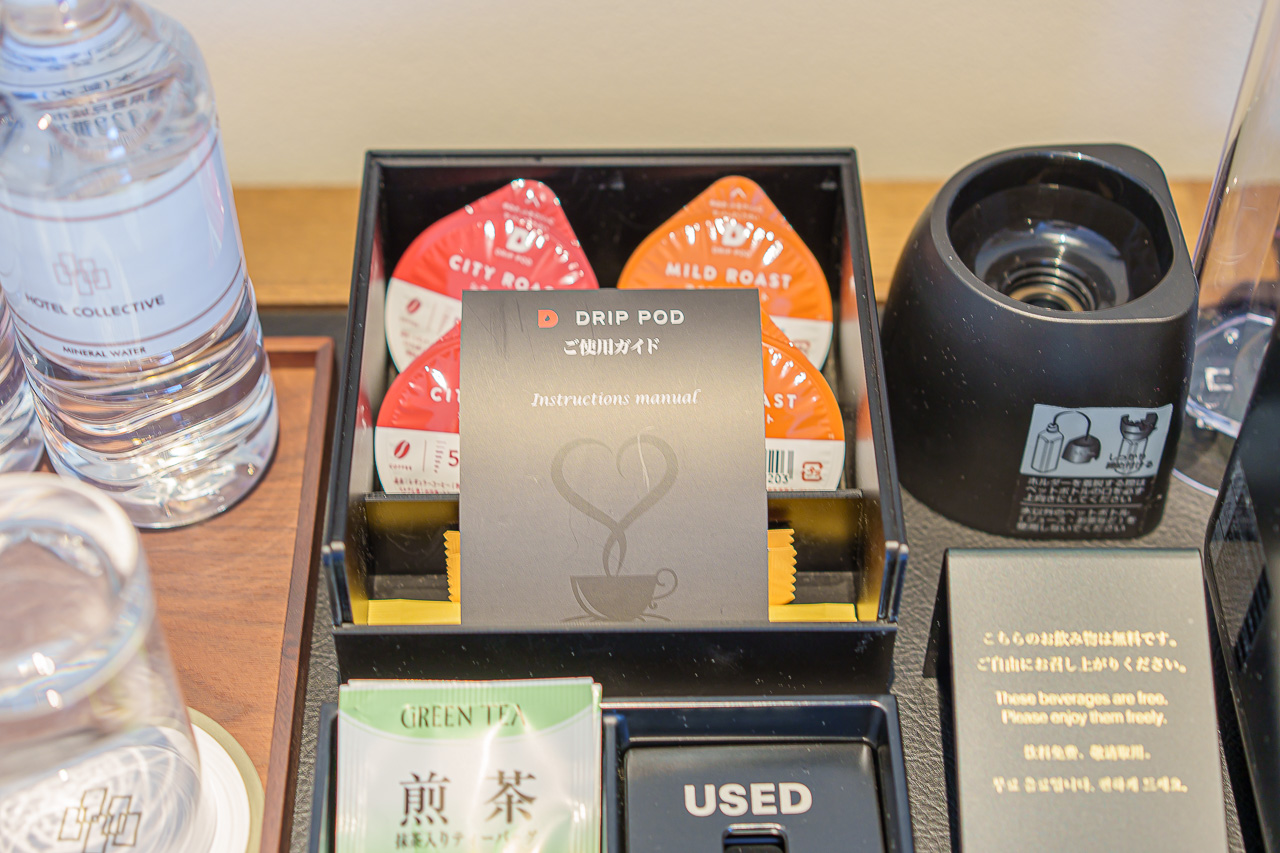 생수와 각종 차, 드립 커피가 세팅되어 있고