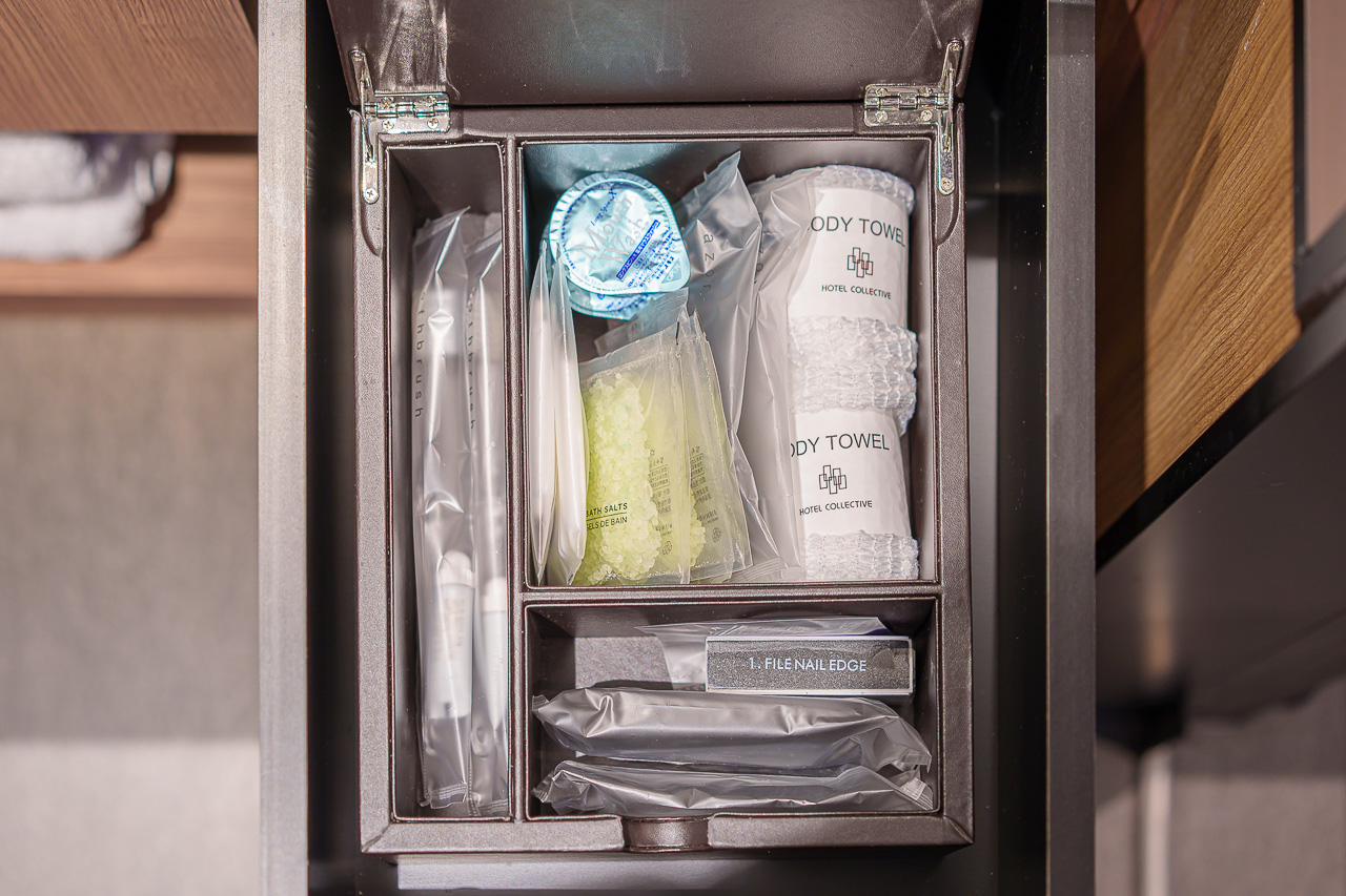 세면대를 열어 보면 숨어 있던 어메니티가 툭 하고.