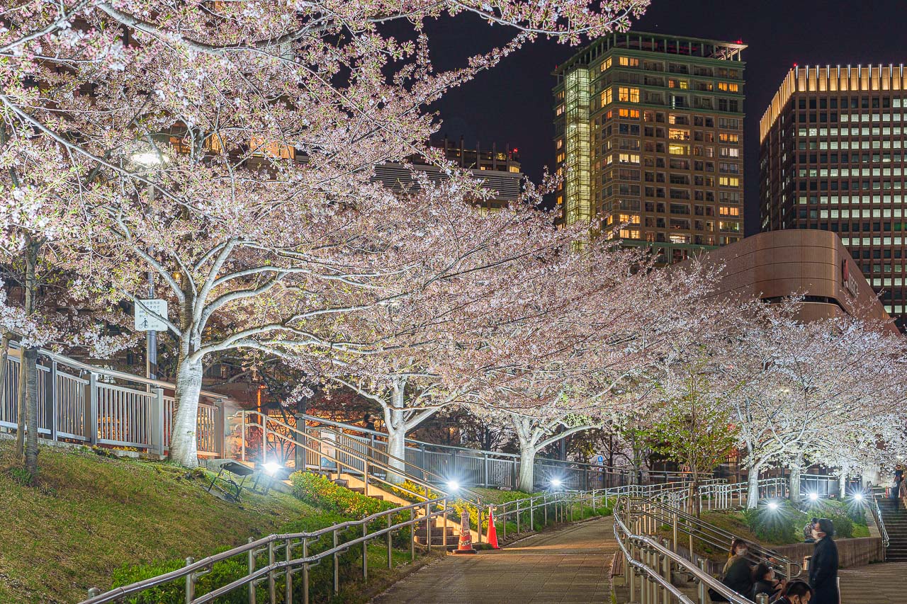 전철과 벚꽃이 어우러져 아름다운 야경을 만들어 냅니다.