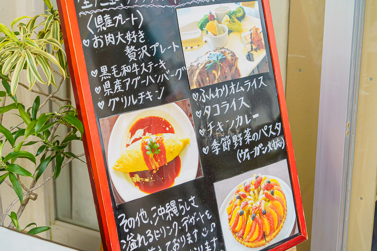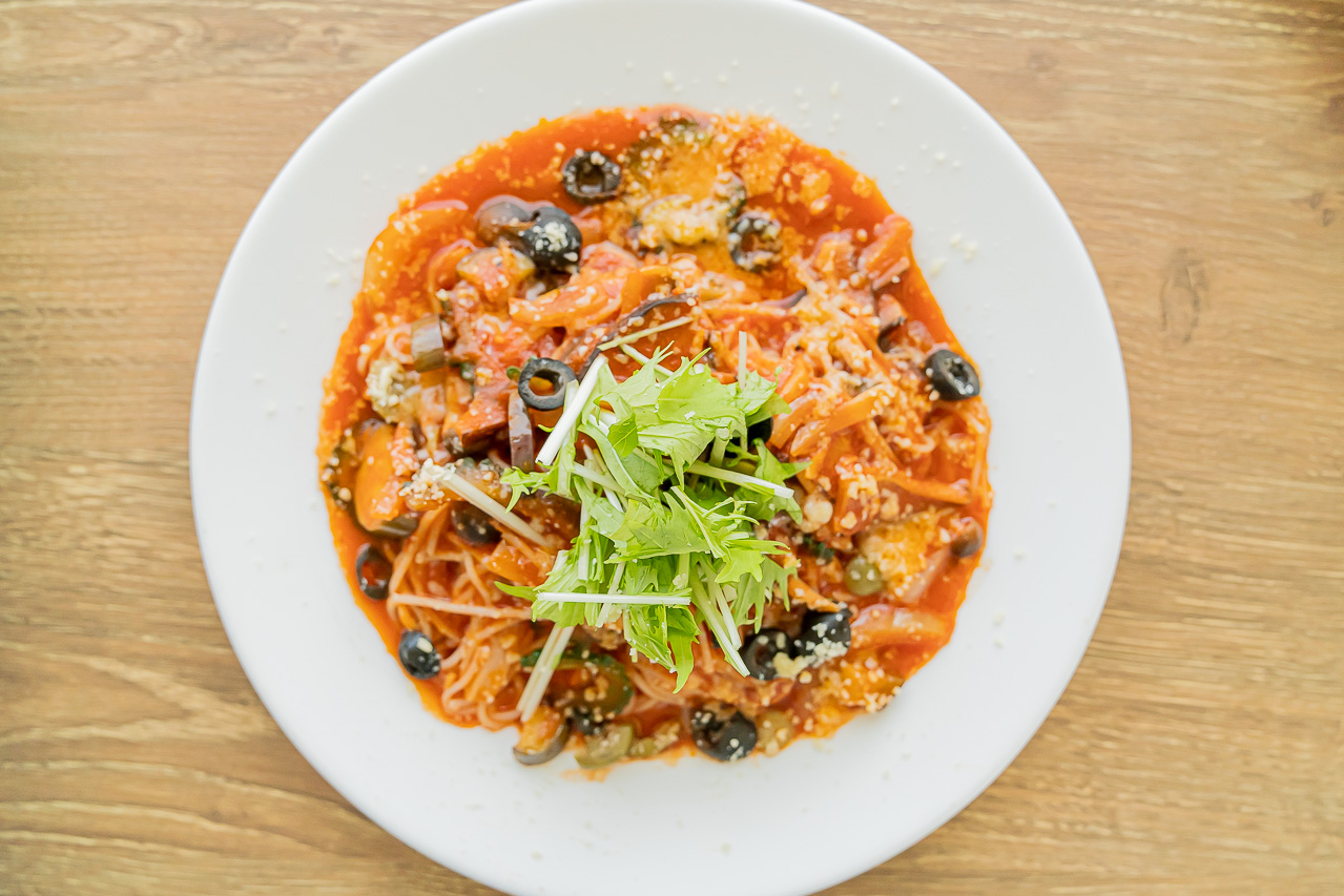 가게의 메인 메뉴인 "계절 야채가 가득 들어간 토마토 파스타"와 오키나와 소울 푸드인 "타코 라이스"를 시켰습니다.