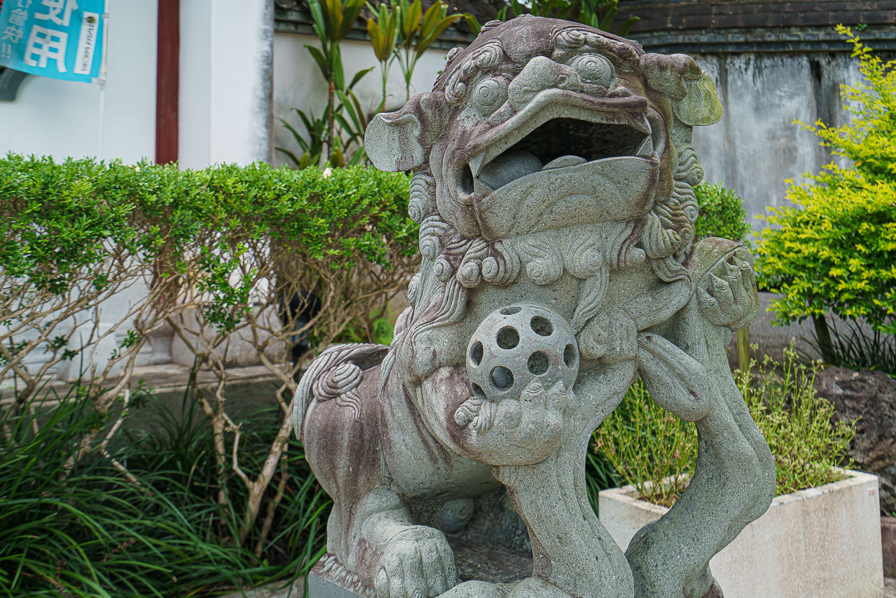 후쿠슈엔의 입구에는 오키나와의 심벌인 "시사"가 공을 들고 반갑게 맞아 줍니다.