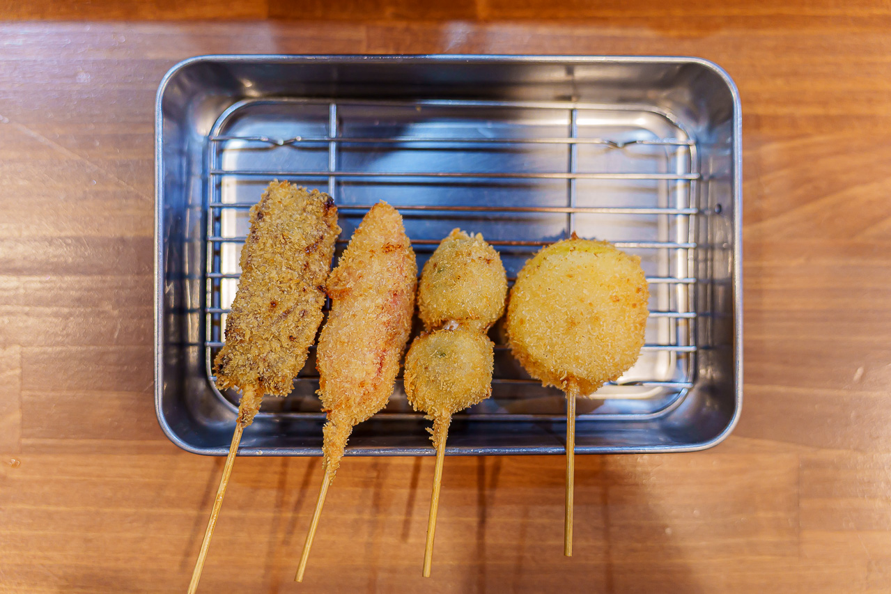 왼쪽부터 오리지널 소고기 쿠시카츠, 타라코(명란젓), 장어, 그리고 마지막은 투어 한정 쿠시카츠입니다.