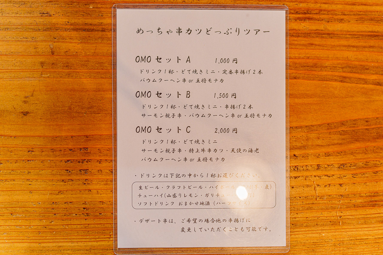 "쿠시카츠 매력에 빠져들자" 투어만의 메뉴가 있고 금액은 1,000엔, 1,500엔, 2,000엔 총 3가지 메뉴가 있었습니다.