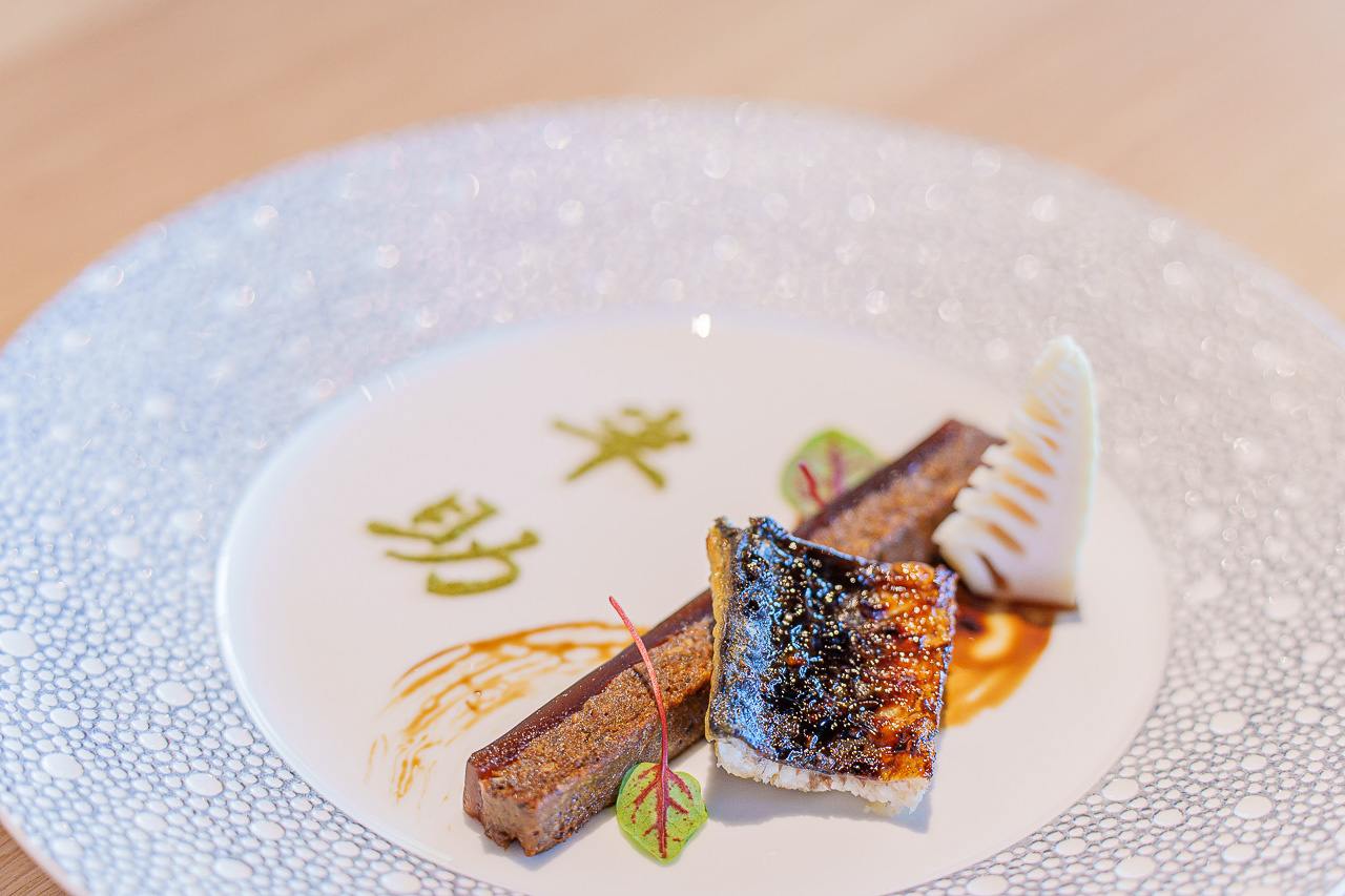 복어가 들어간 요리로 복어와 각종 야채, 이리 사케, 파 아이스크림이 들어가 있습니다.