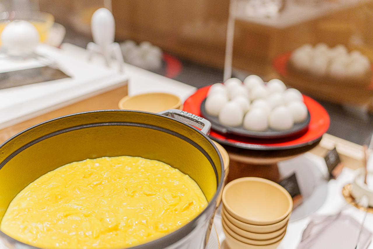 스크램블 에그와 타코야키 판에 들어가 있는 삶은 달걀