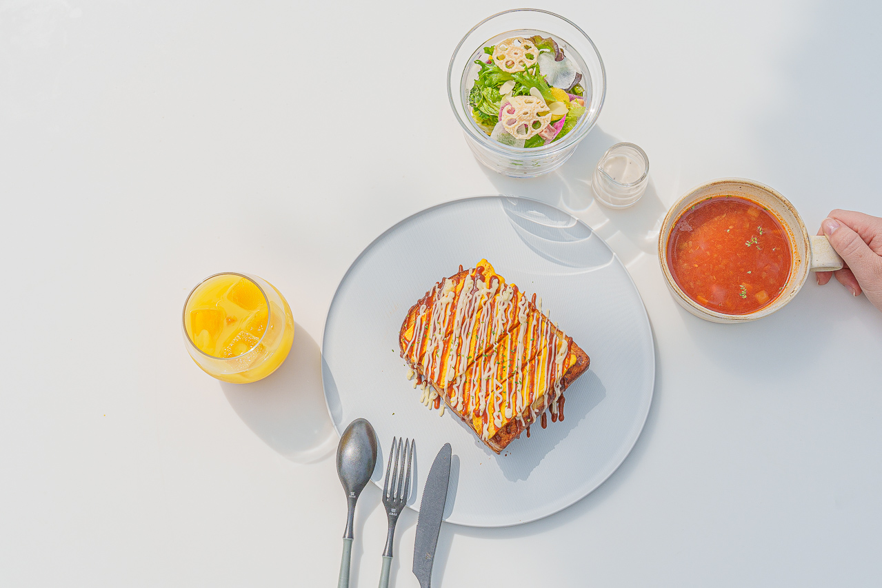 오코노미야키 소스가 뿌려진 계란 햄 치즈 토스트 "크로크 오칸 세트" 1,250엔