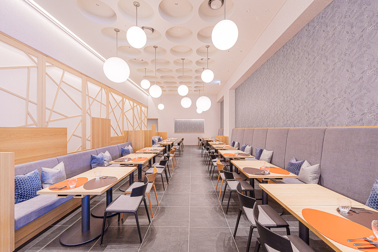 레스토랑은 둥근 간접 조명을 사용하여 몽환적인 느낌이 듭니다.