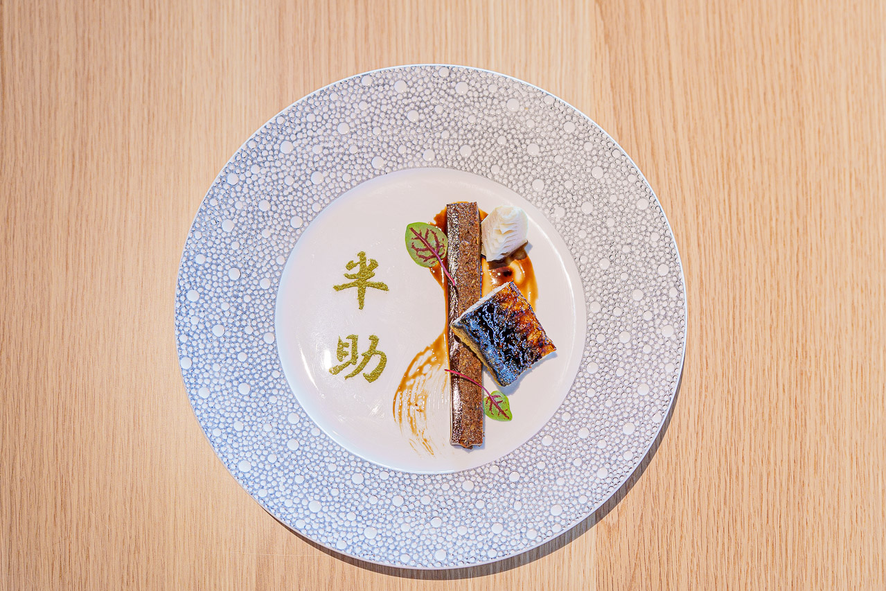 복어가 들어간 요리로 복어와 각종 야채, 이리 사케, 파 아이스크림이 들어가 있습니다.