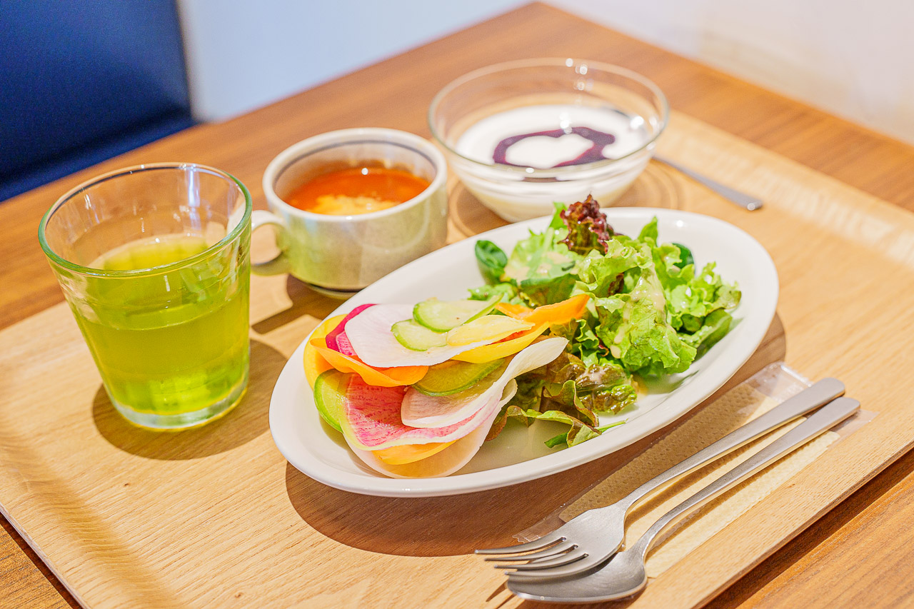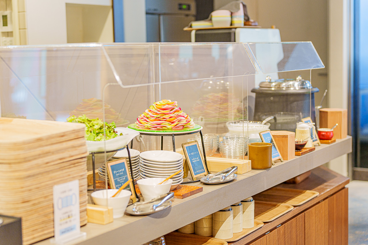 OMO5 교토 산조 by 호시노 리조트의 조식은 5종류의 메인 메뉴에서 하나를 고르고 샐러드 바와 토마토 수프, 요구르트를 골라서 먹을 수 있는 세미 뷔페 형식입니다.