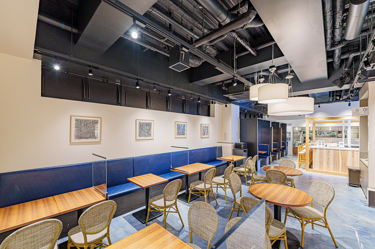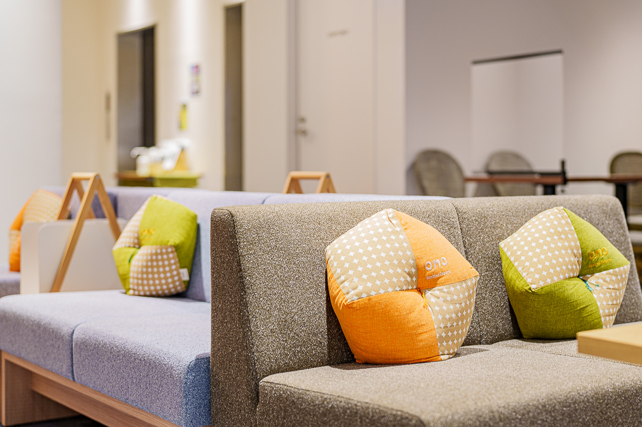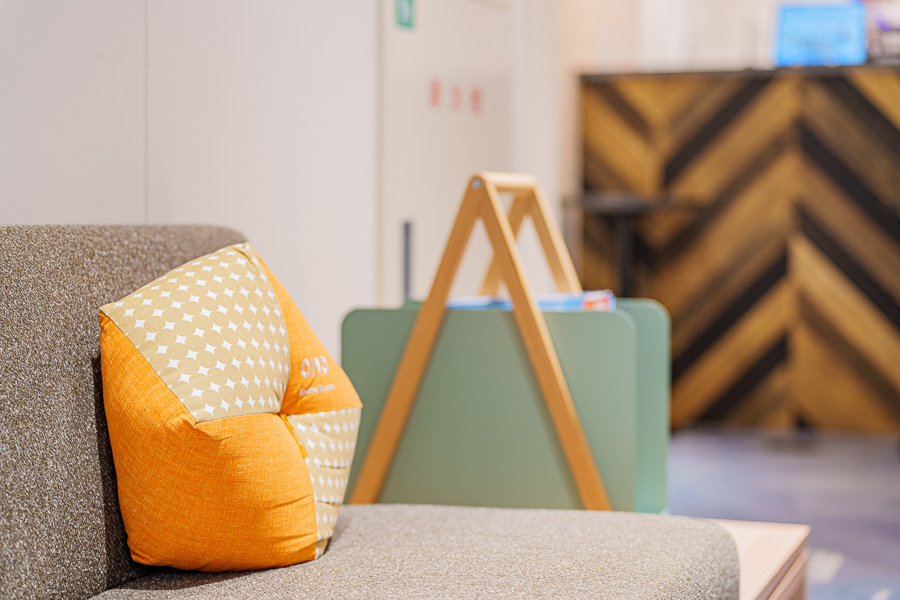 프런트 주변에는 귀여운 OMO로고가 있는 쿠션과 소파가 배치되어 있습니다.