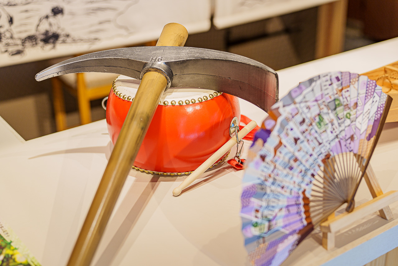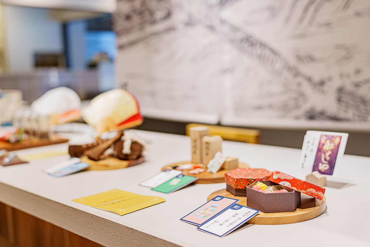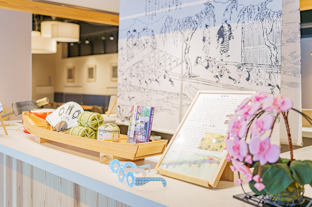 OMO베이스에는 산조의 명소 "타카세가와"를 그린 일러스트와 당시 사용 됐다고 전해지는 배, 그리고 역사에 등장하는 각종 오브제들이 전시되어 있어 궁금증을 더합니다.