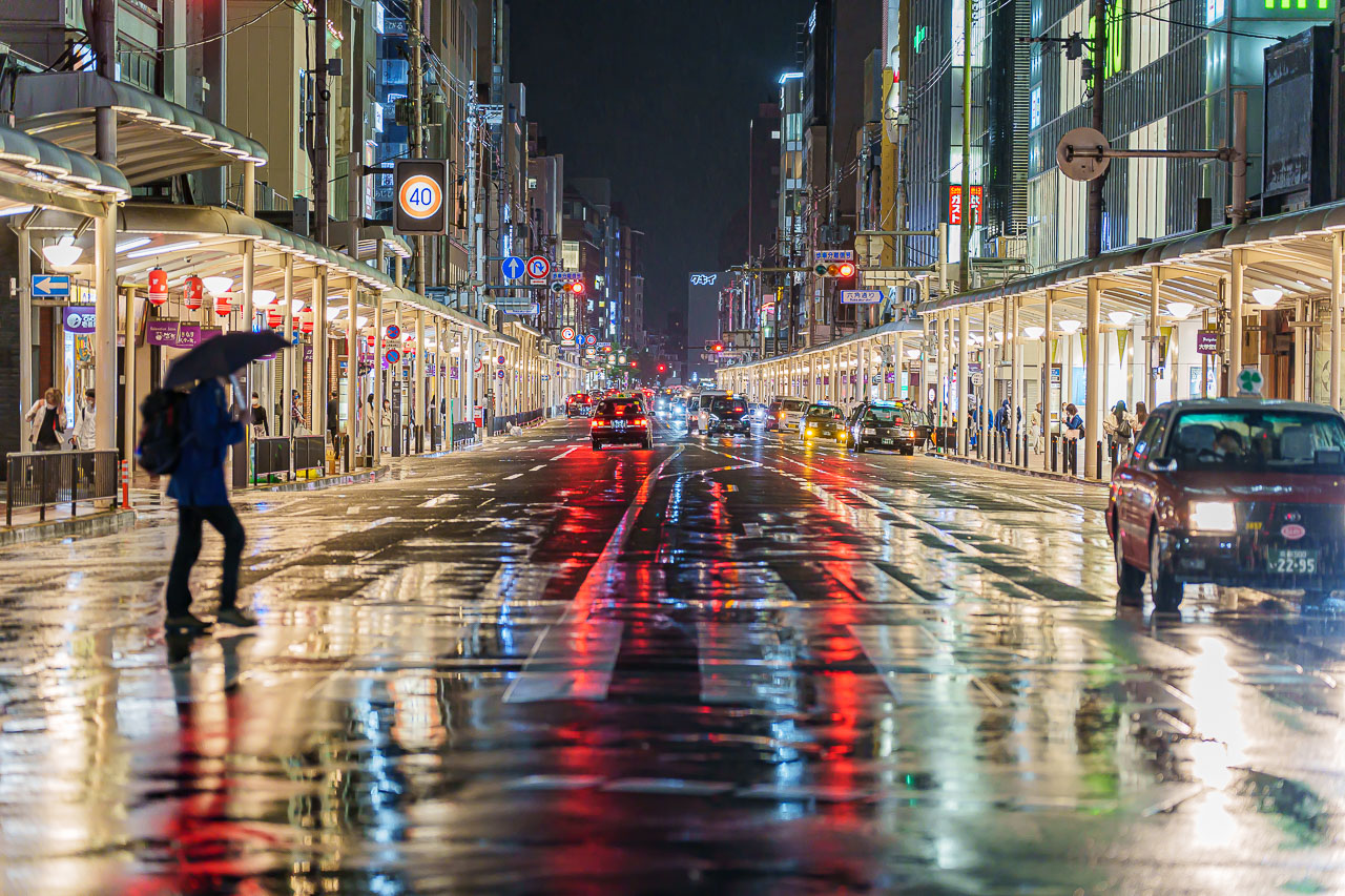저녁에는 비가 주룩주룩 내렸는데 교토 산조의 거리가 반짝반짝 빛납니다.