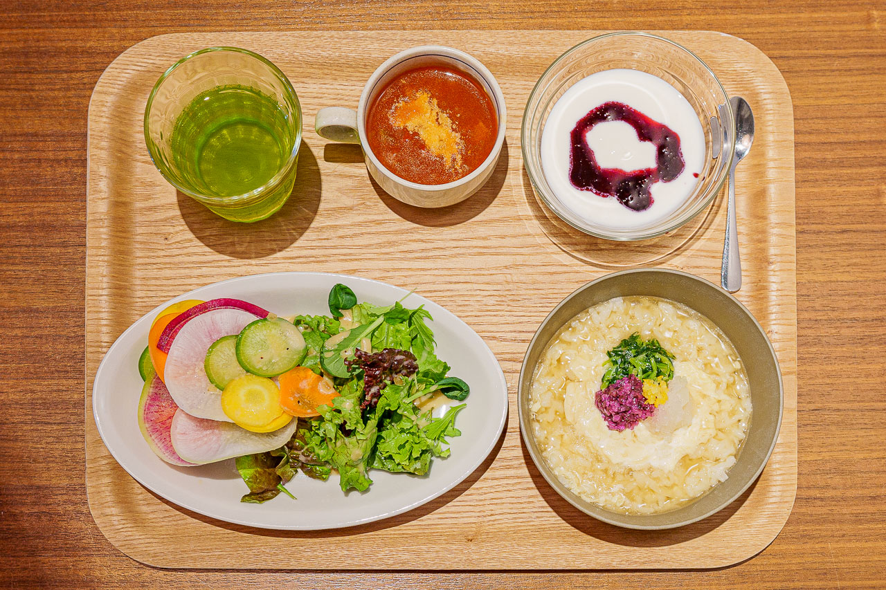 OMO5 교토 산조 by 호시노 리조트의 조식은 5종류의 메인 메뉴에서 하나를 고르고 샐러드 바와 토마토 수프, 요구르트를 골라서 먹을 수 있는 세미 뷔페 형식입니다.