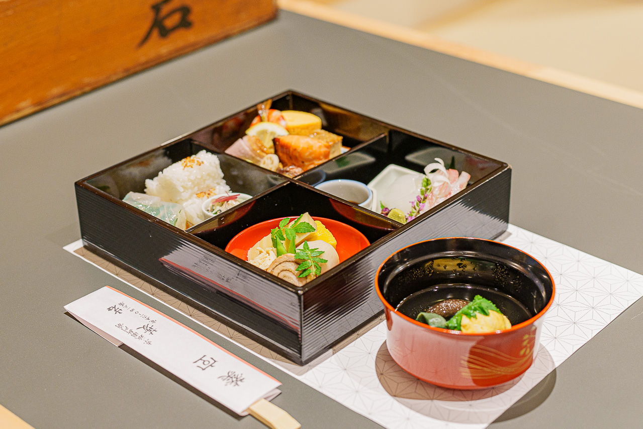 예절과 형식을 깐깐하게 따지는 기온에서는 도시락의 방향도 정해져 있어, 요 금빛 나는 줄무늬가 먹는 사람 쪽으로 향해야 합니다.