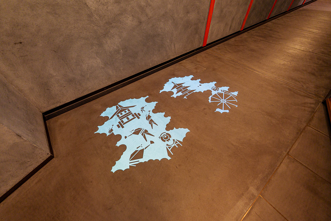 프런트 바닥에는 기온 마을의 역사를 한눈에 있는 프로젝션 맵핑이 있어 귀엽습니다.