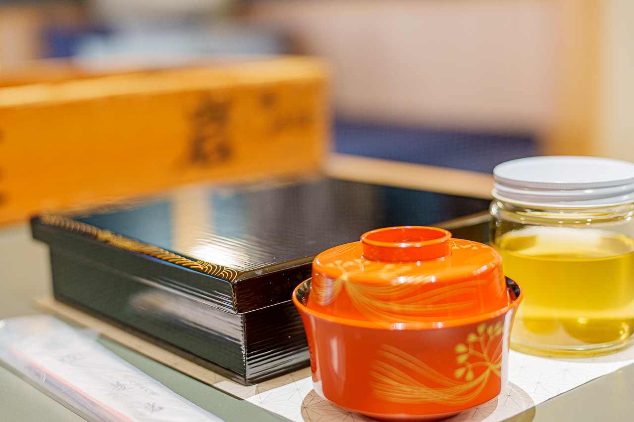 예절과 형식을 깐깐하게 따지는 기온에서는 도시락의 방향도 정해져 있어, 요 금빛 나는 줄무늬가 먹는 사람 쪽으로 향해야 합니다.