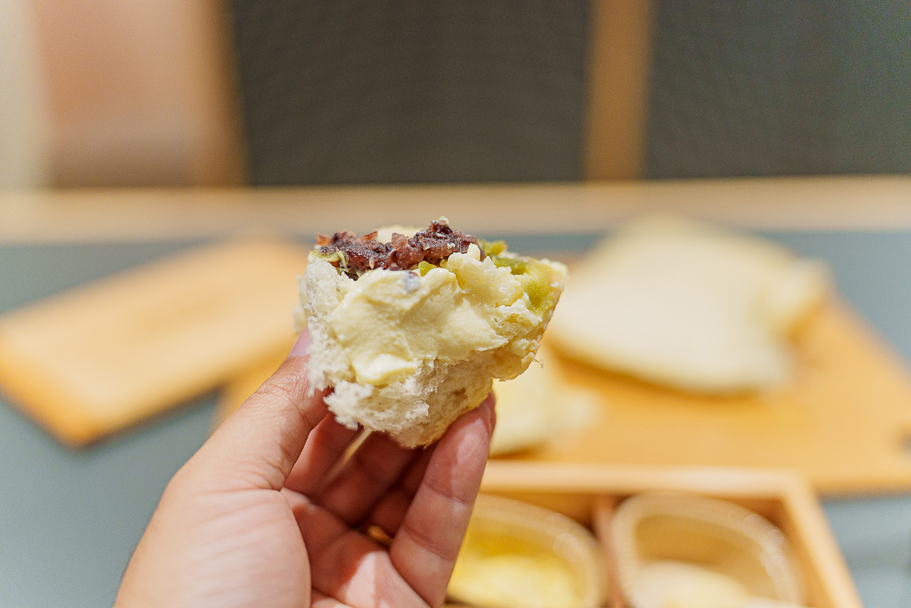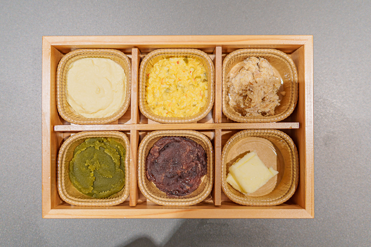 왼쪽 위에서 부터 시계 방향으로 소이 밀크 잼, 계란 스프레드, 돼지고기 리예트, 버터, 팥 스프레드, 말차 스프레드입니다.