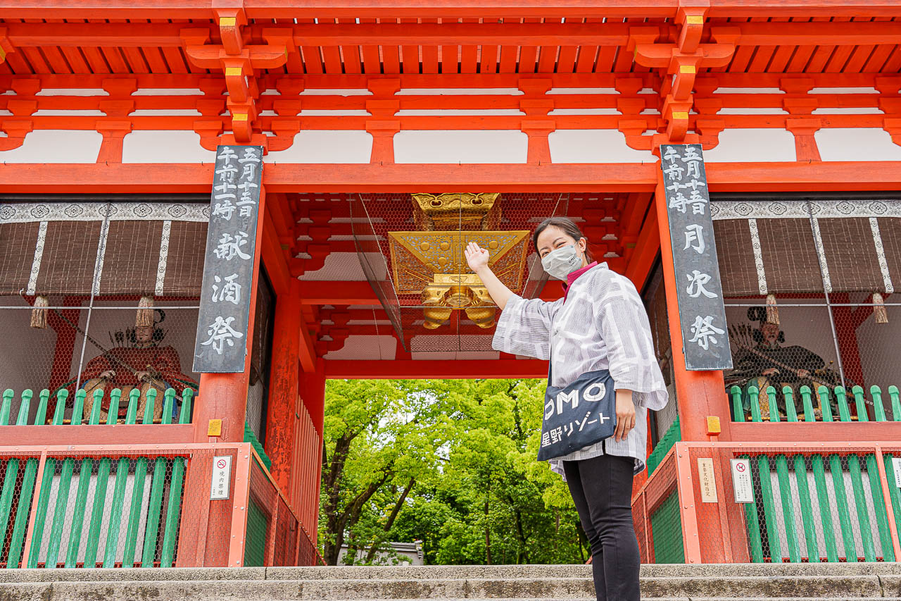 "OMO5 교토 기온 by 호시노 리조트"는 시조 거리에서 보이는 빨간 신사 "야사카 신사"의 바로 앞에 위치해 있습니다.