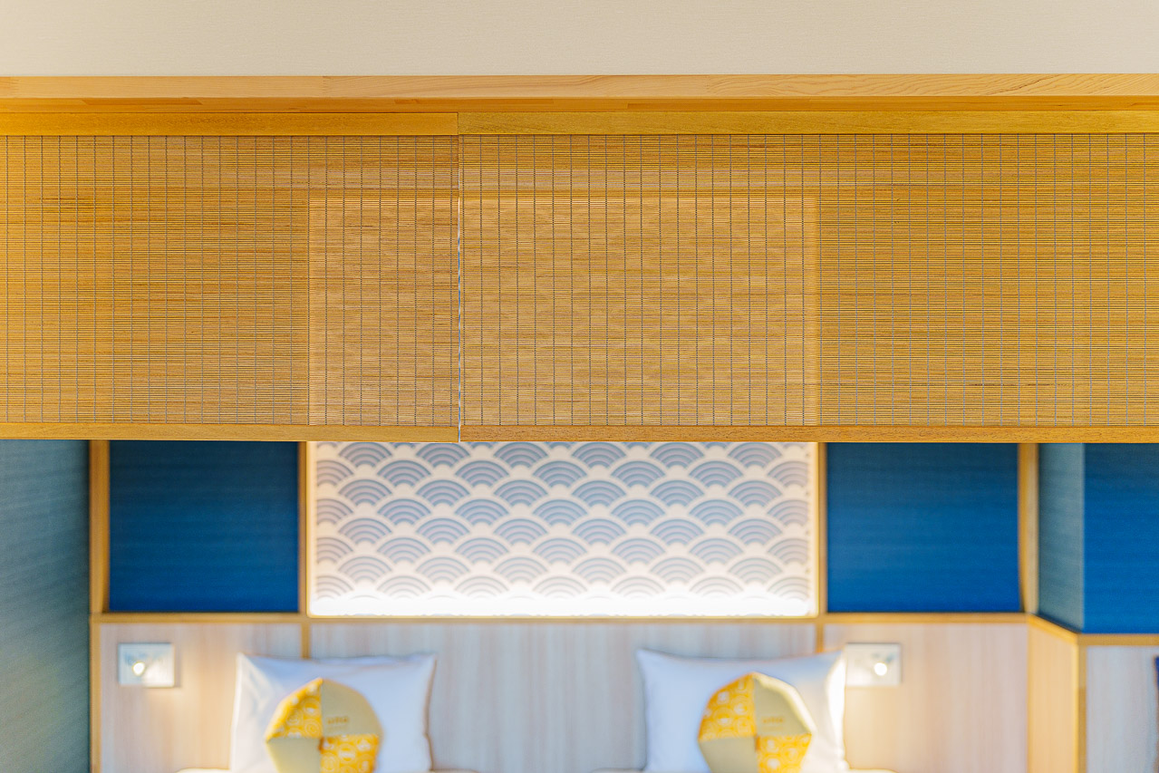 침대 뒤쪽에는 일본스러운 디자인의 무늬가 벽에 그려져 있습니다.