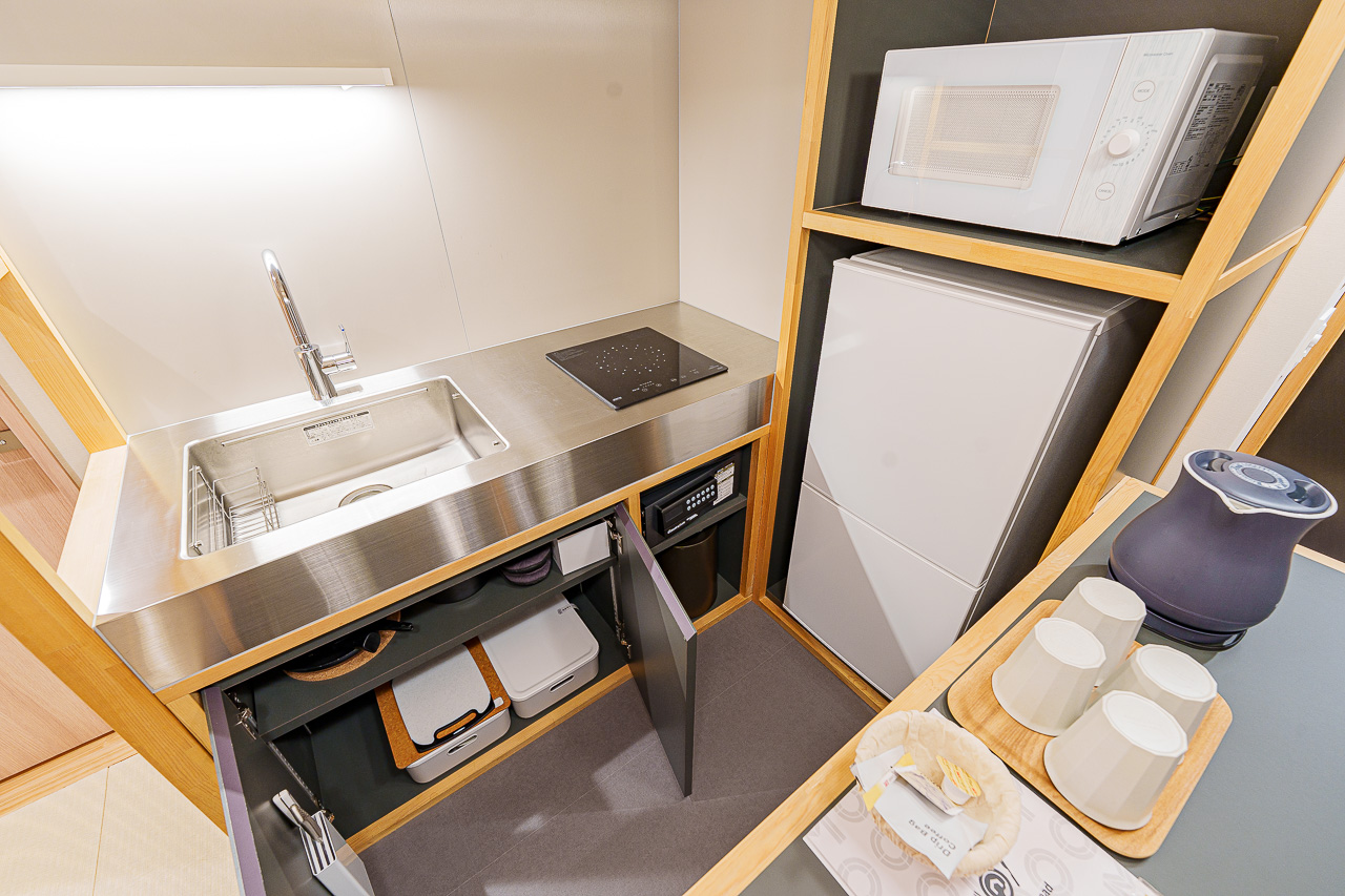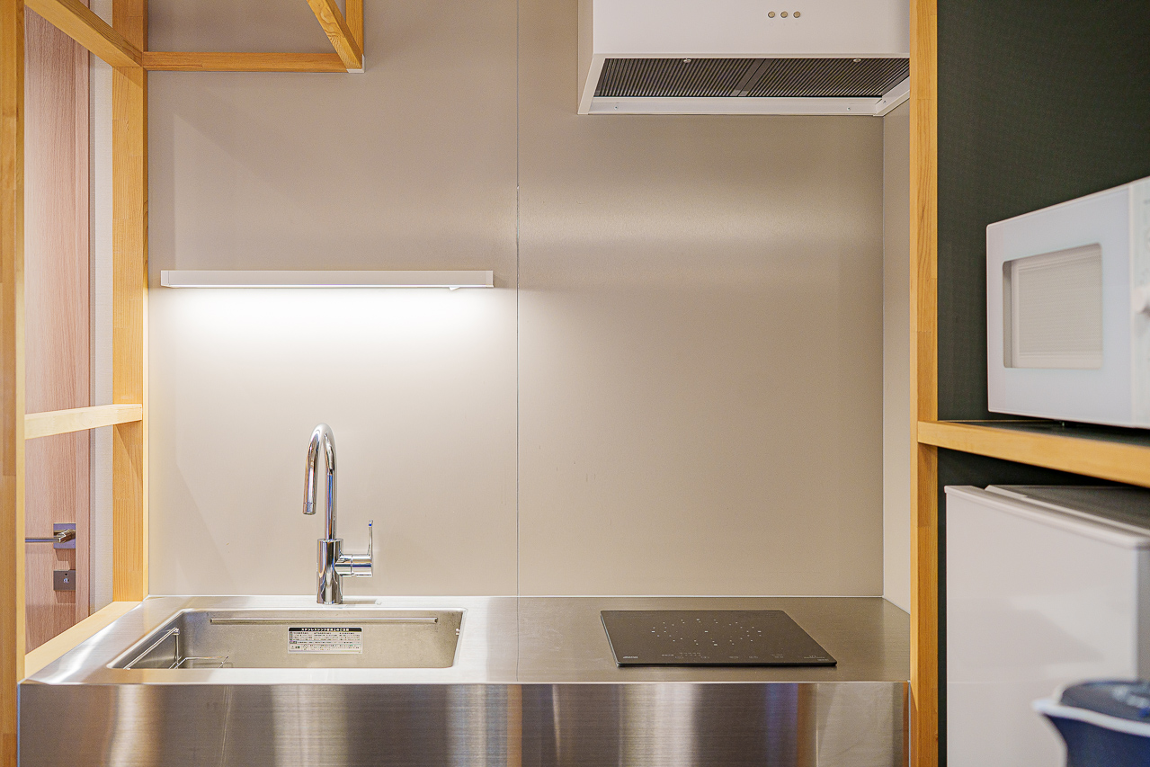 주방은 싱크대와 IH, 식기, 전자레인지 등이 다 준비되어 있어 편리하게 이용이 가능합니다.