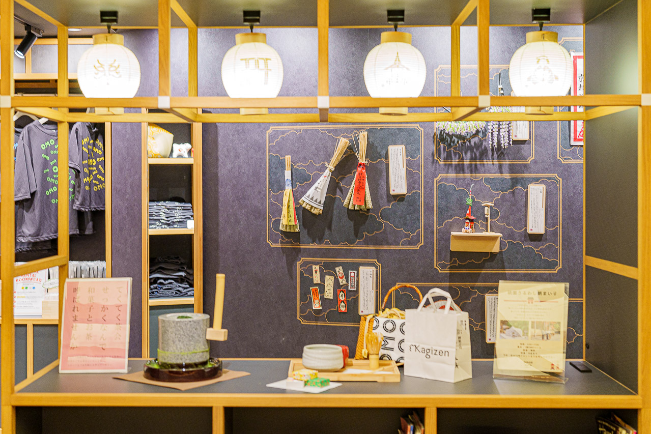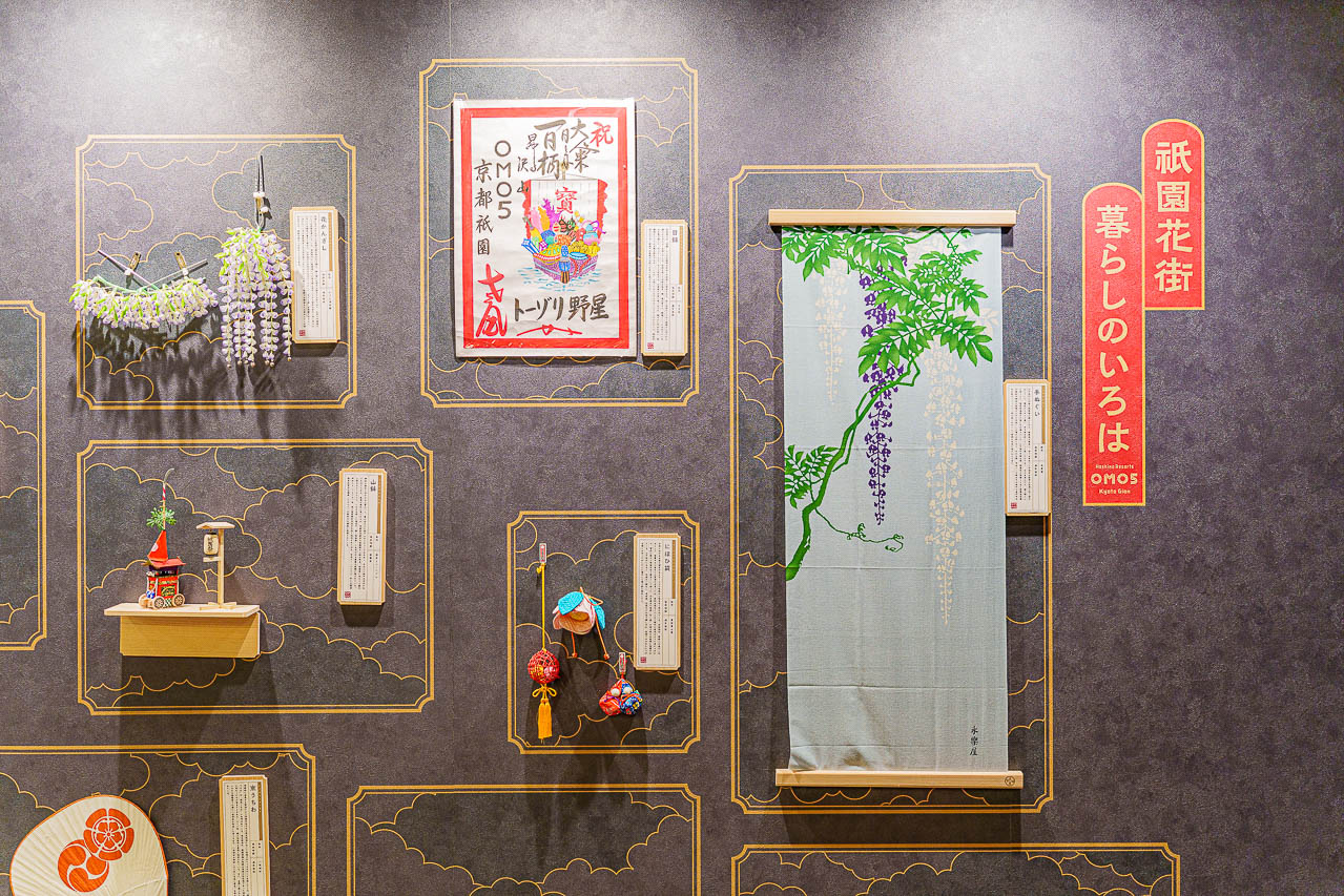 벽의 한켠에는 교토를 대표하는 오브제들이 잔뜩 걸려 있습니다.