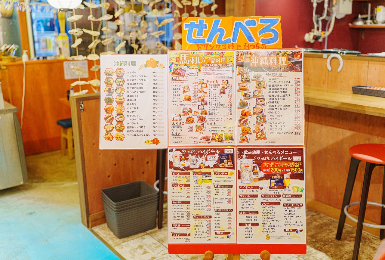 센베로(せんべろ)는 1,000엔(せん)으로 헤롱헤롱(ベ ろ)이 합쳐진 단어로 1,000엔에 술 3잔과 안주 1개를 먹을 수 있는 오키나와 명물입니다.