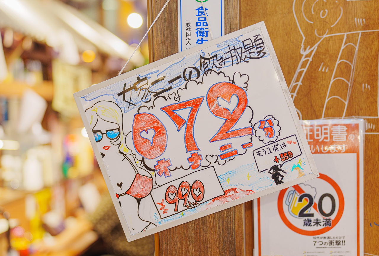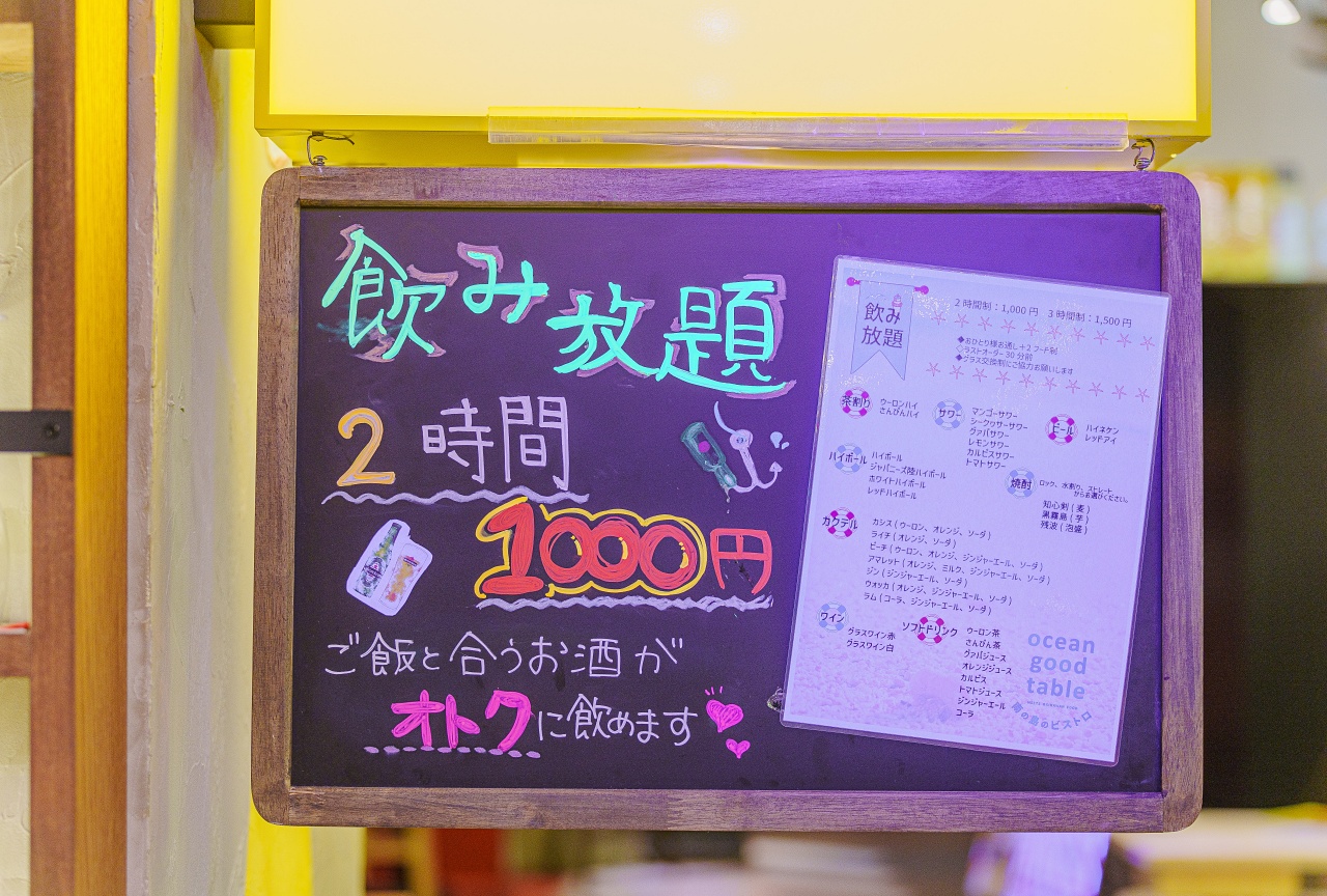분위기만 봐서는 꽤나 비싸 보이는데, 2시간에 1,000엔으로 술 무한 리필이 가능합니다.