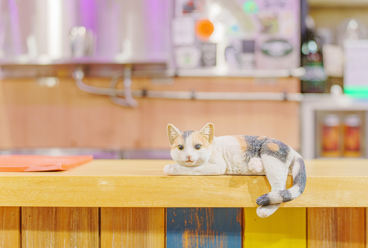 눈을 동그랗게 뜨고 있는 고양이 오브제가 귀엽습니다.