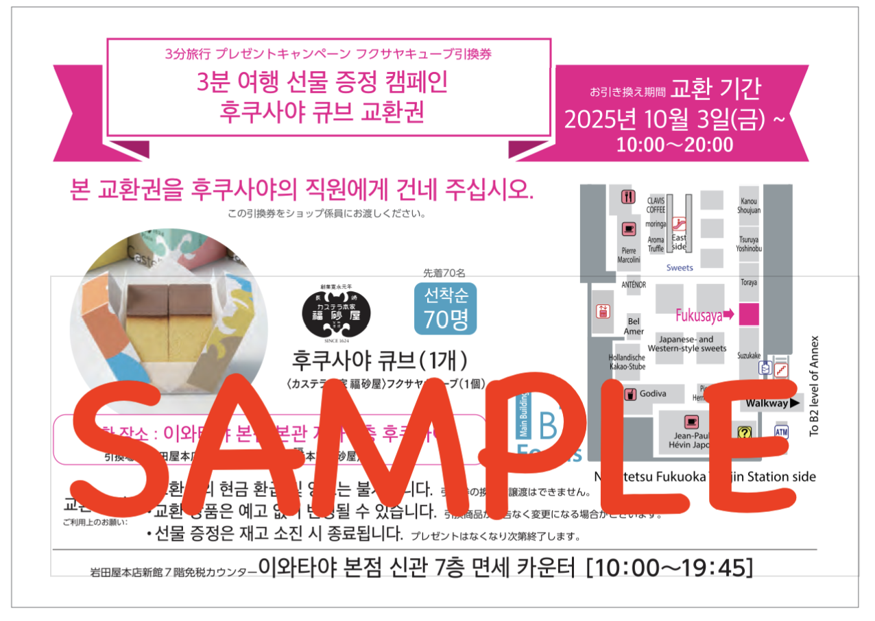 먼저 이와타야 백화점의 경우, 신관 7층의 면세 카운터에서 면세 수속을 할 때 위의 이미지를 다운로드해 보여주면 후쿠사야 교환권을 받을 수 있습니다. 이 교환권을 가지고 본관 지하 2층의 후쿠사야 매장에 방문하면 카스테라를 교환할 수 있으며, 총 70명에게만 제공되는 한정 이벤트입니다.