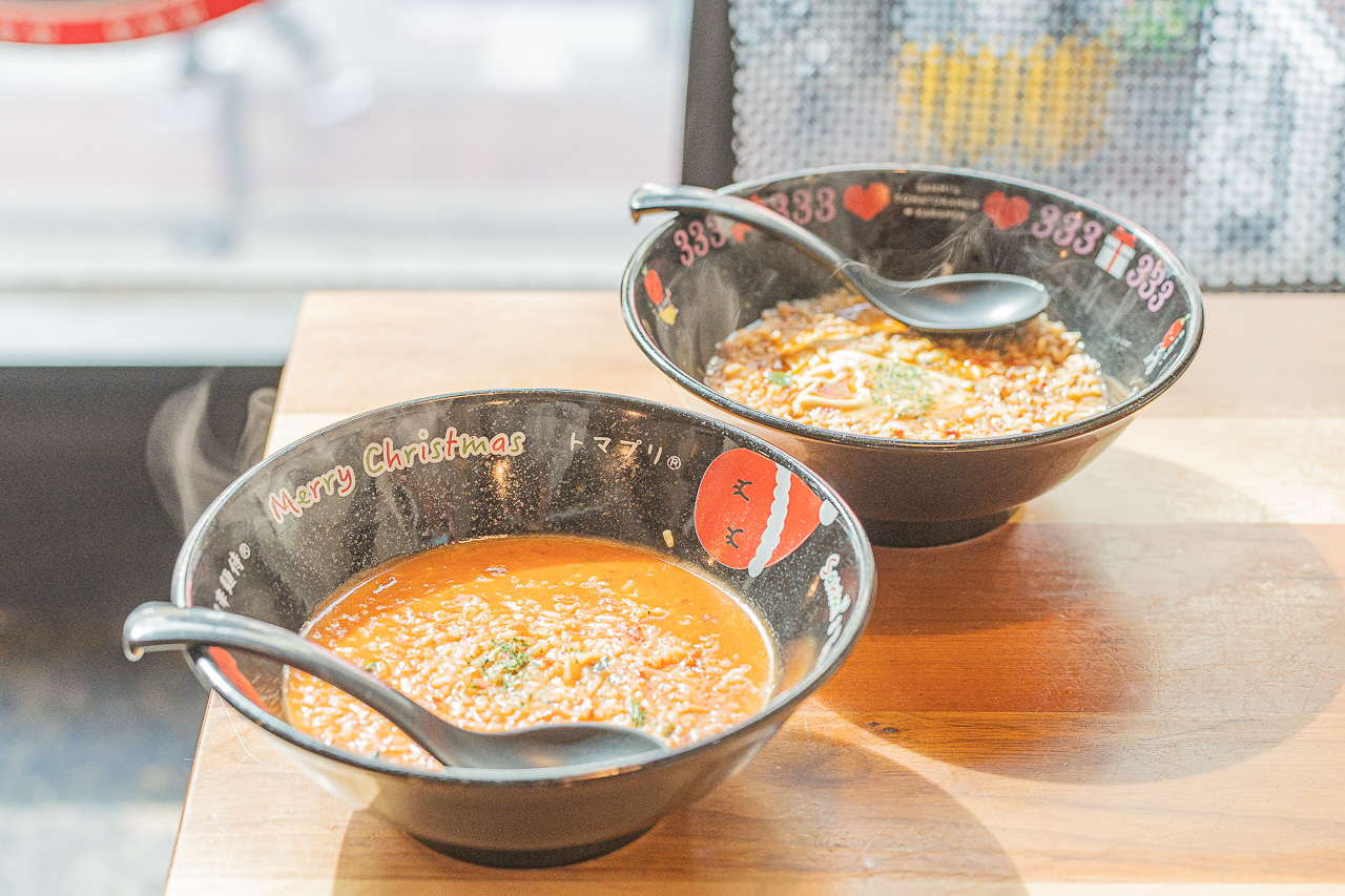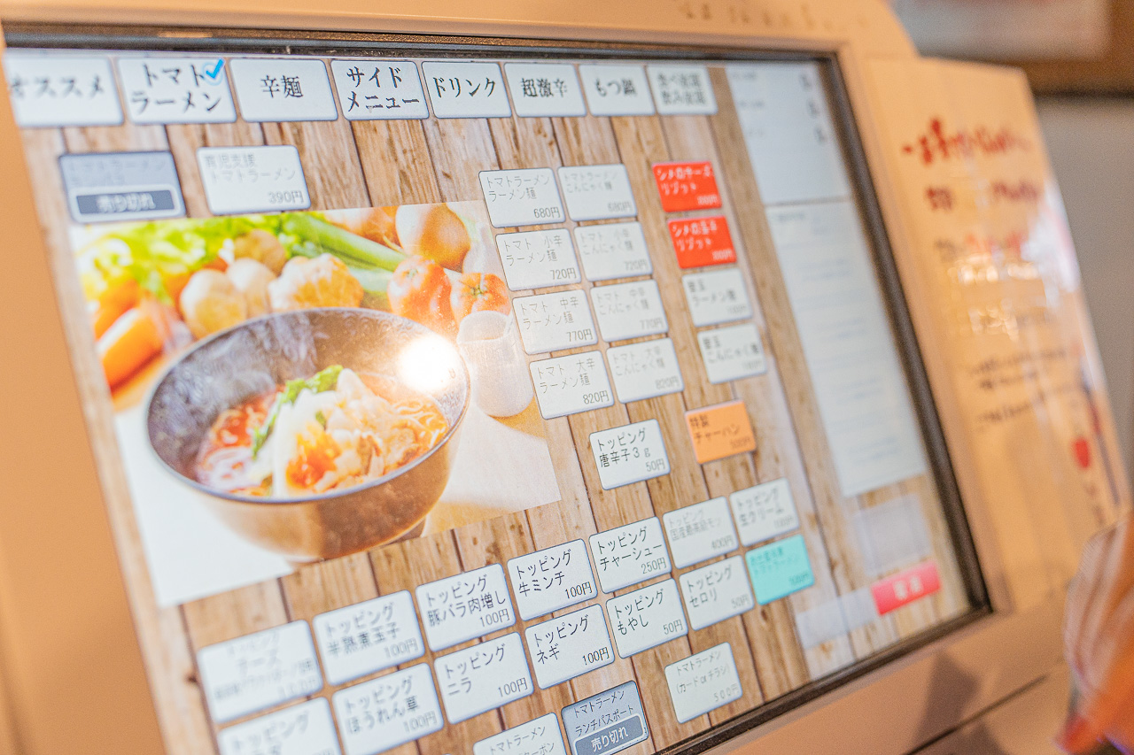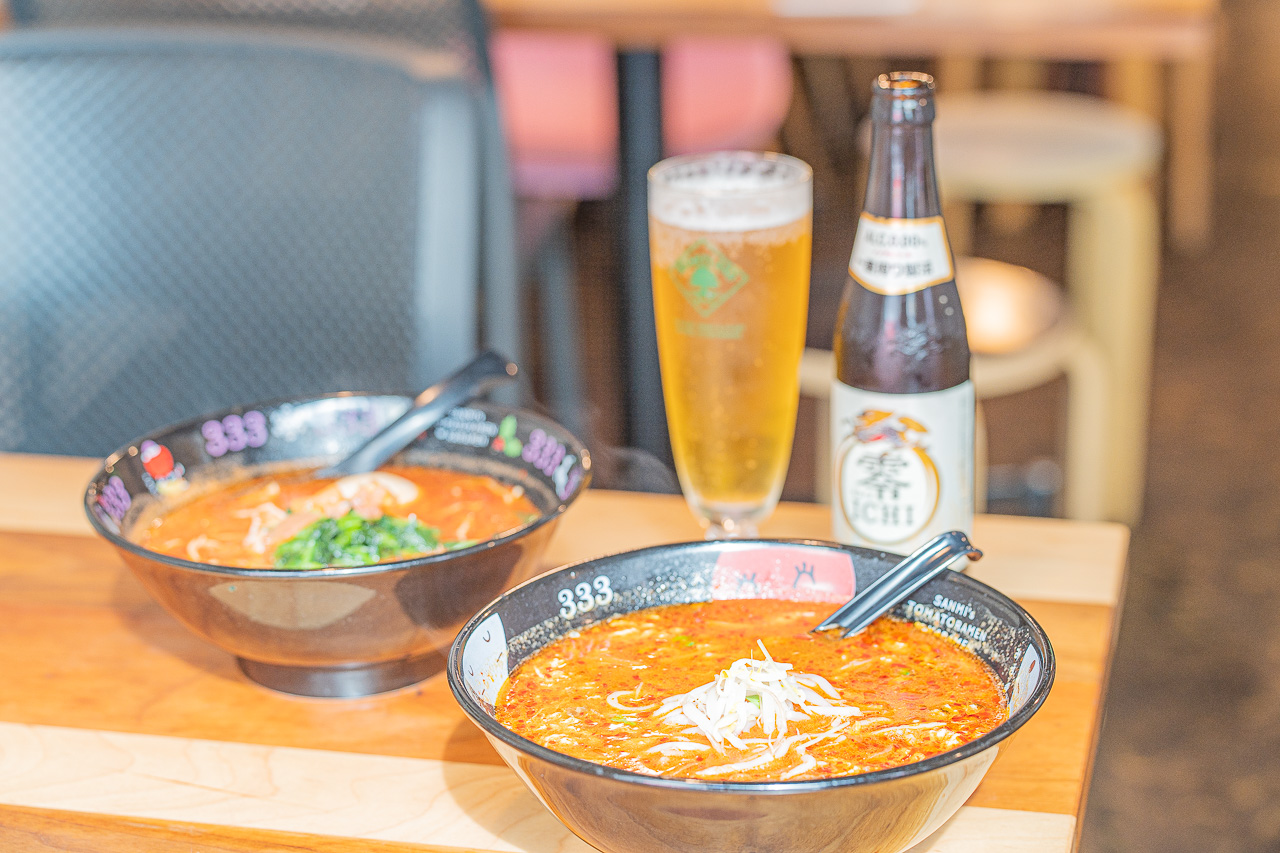 토마토라면은 단맛, 신맛, 감칠맛이 나는 토마토와 향미채소 국물에 스트레이트 가는 면이 특징이며 파스타 느낌으로 먹을 수 있습니다. 매운면은 7단계의 매운맛을 선택할 수 있는 스파이시한 라면으로 마신 후 마무리로도 추천합니다. 또한 토마토 모치나베라는 새로운 장르의 냄비도 제공하고 있습니다.