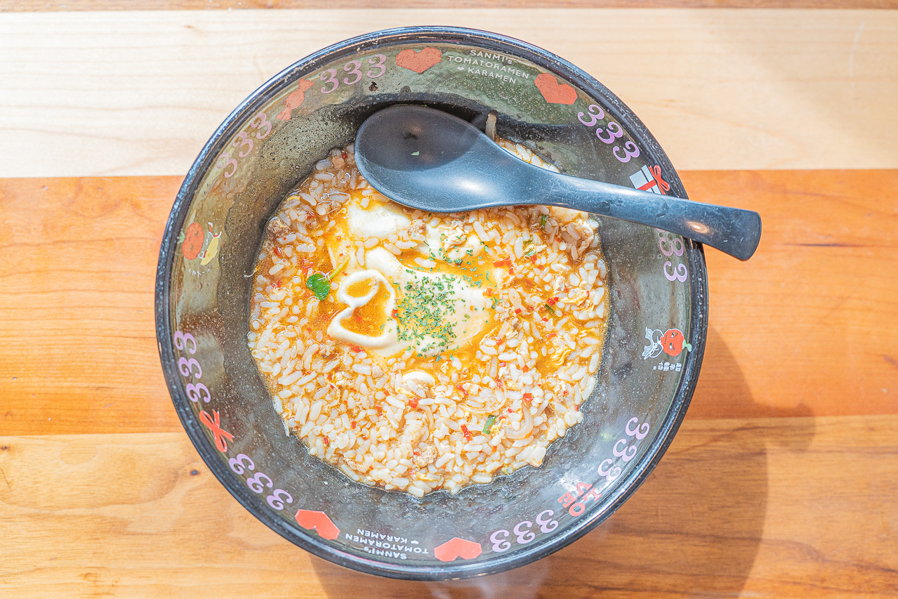 후쿠오카 토마토라멘 산미의 리조또 서비스는 라멘을 다 먹고 남은 국물에 리조또를 만들어주는 서비스입니다.