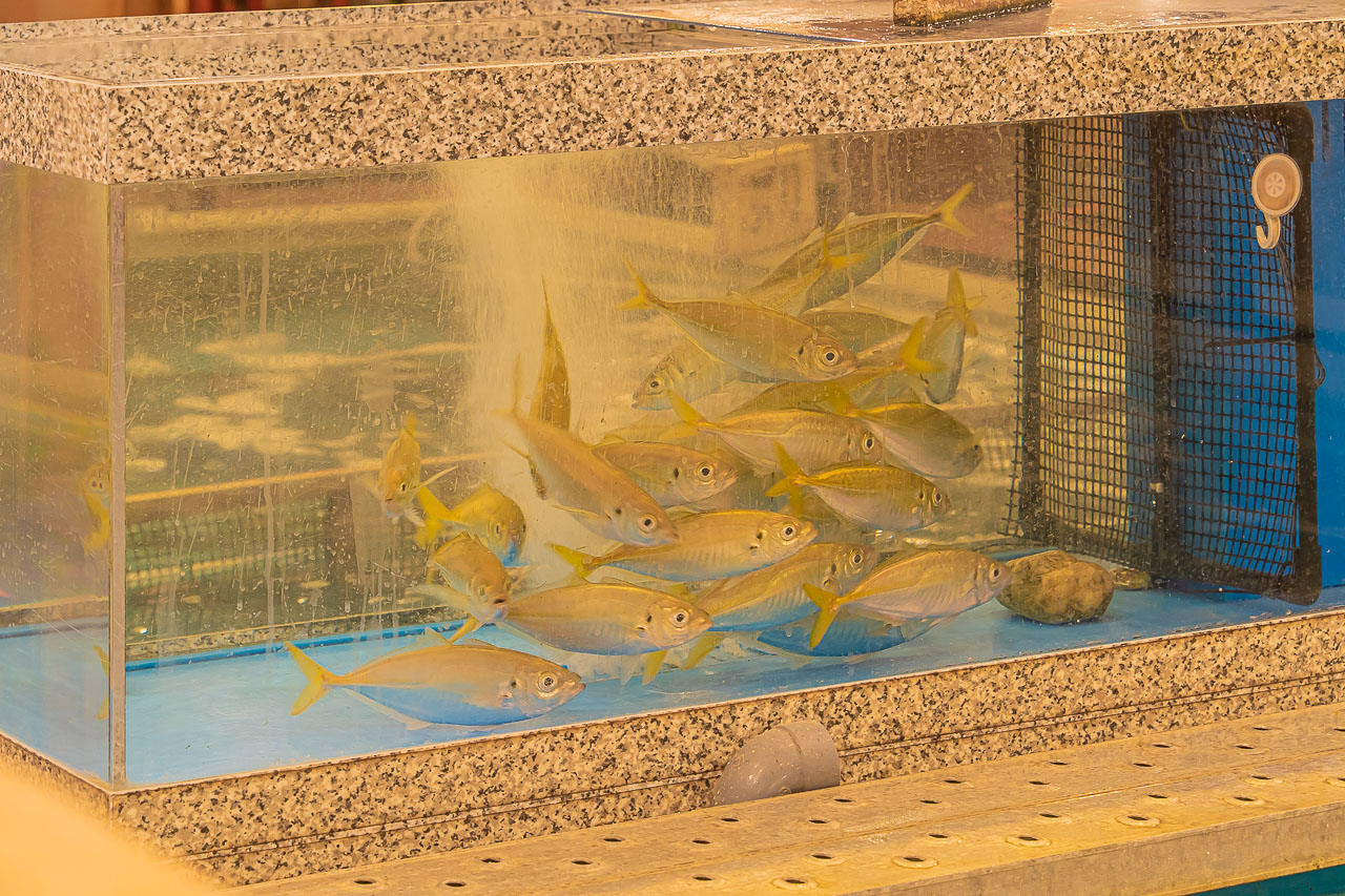 실내에는 큰 수조가 있고 신선한 생선들이 헤엄치고 있다.