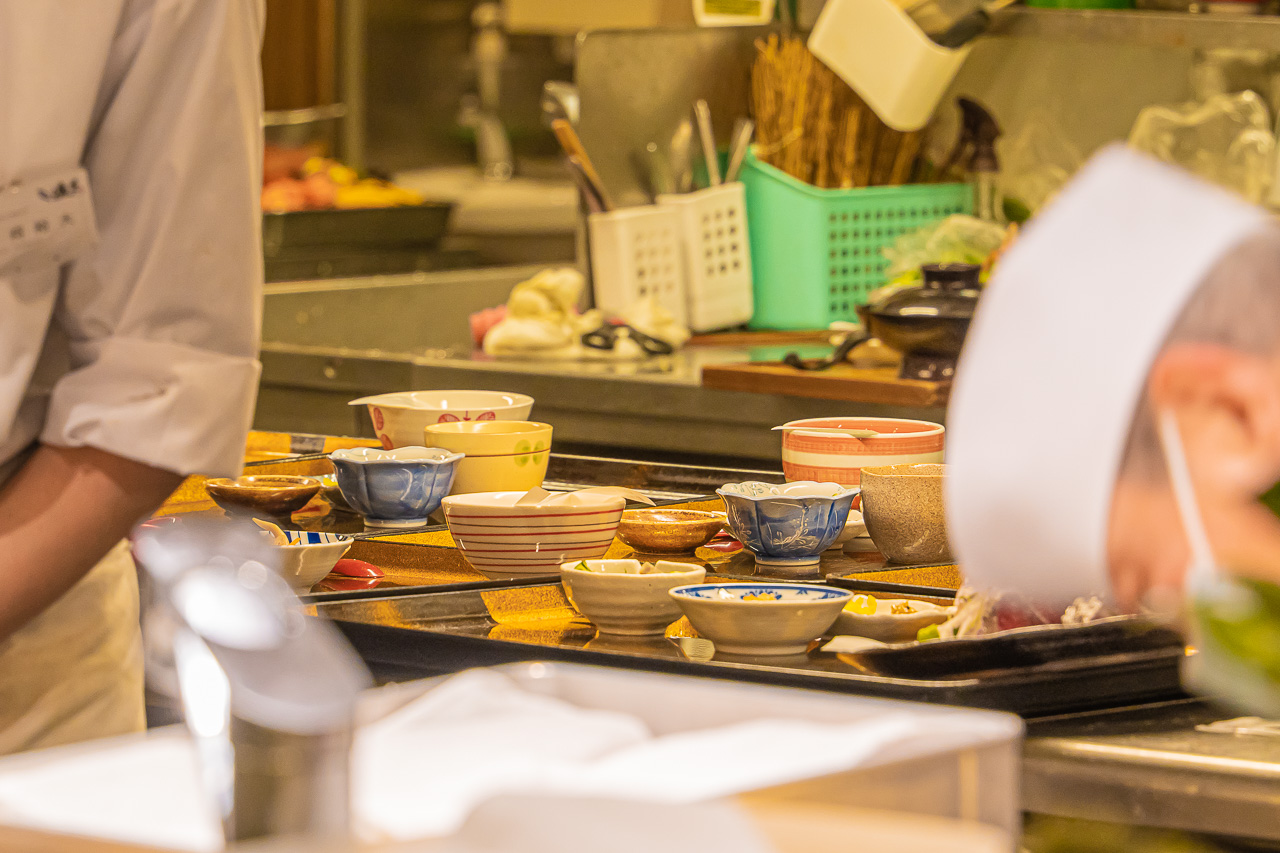 주방에서는 손님에게 내어줄 고치현의 브랜드 쌀인 "긴샤리(銀シャリ)"를 미니 솥 하나하나에 짓고 있습니다.